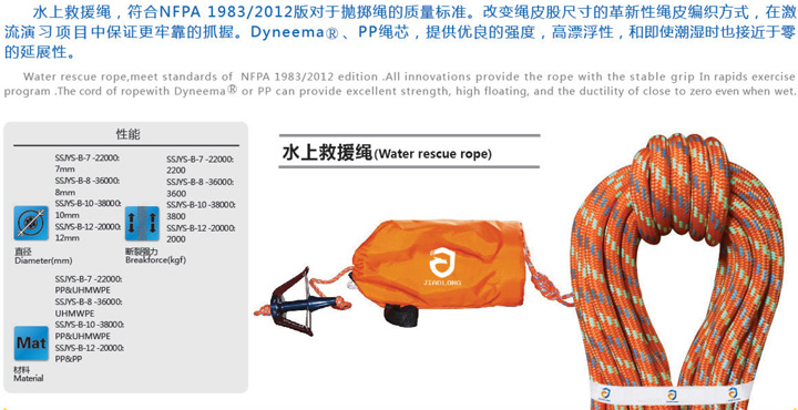 革新性繩皮編織方式,在激流演習項目中保證更牢靠的抓握。質量輕便,可漂浮于水面,繩體用鮮艷的橘紅色或橘黃色亮色系為主,具有反光和夜光功能,在危險時刻容易辨識,為生命保駕護航。可選用丙綸、超高分子量聚乙烯等不同材料,通過先進的生產工藝實現繩索的高強度、易識別、可漂浮等。適用于水上訓練、救援等領域。